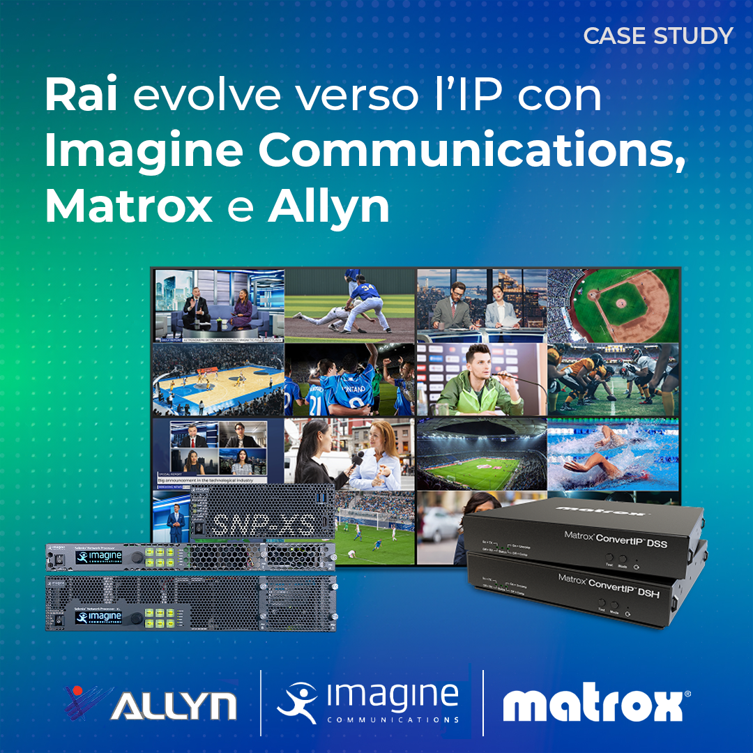 RAI ha avviato un percorso di migrazione graduale da SDI a IP affidandosi ad Allyn che integra un'infrastruttura SMPTE ST 2110 costruita con Selenio di Imagine Communications e ConvertIP di Matrox per workflow scalabili, interoperabili e mission-critical.