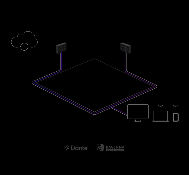 Il sistema operativo HOLOPLOT supporta sia gli standard Dante che Ravenna (inclusi AES67 e ST2110), ospitando fino a 256 canali con Seamless Protection Switching (ST-2022-7).