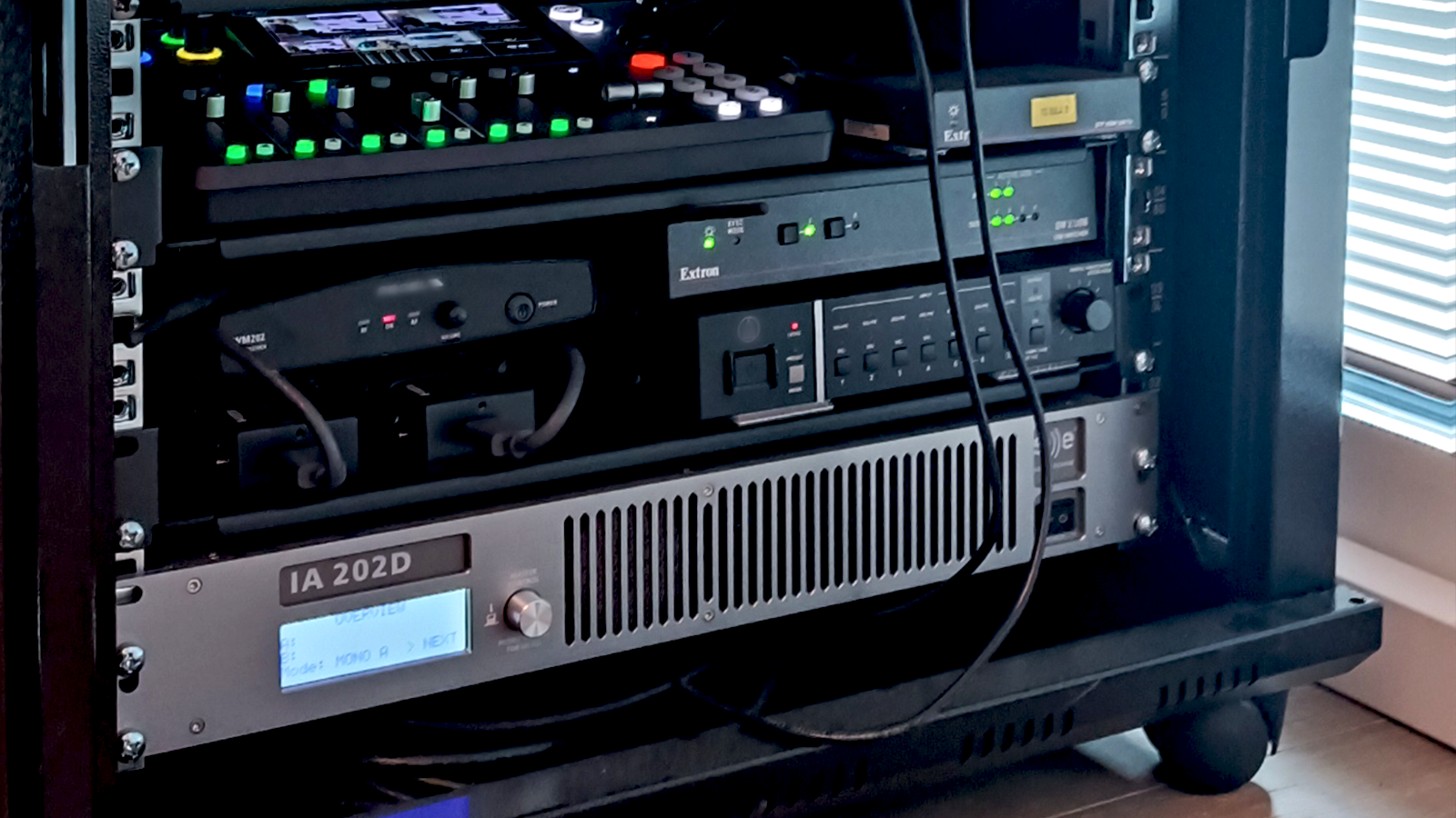 Il cuore della sala convegni è custodito all’interno del rack posizionato in prossimità del ledwall e, al cui interno, trovano posto i componenti Extron della serie DTP 4K e HD 4K Plus — inclusi trasmettitori, ricevitori e distributori HDMI — che garantiscono la trasmissione dei segnali fino a 70 metri senza perdita di qualità e con gestione remota via rete.