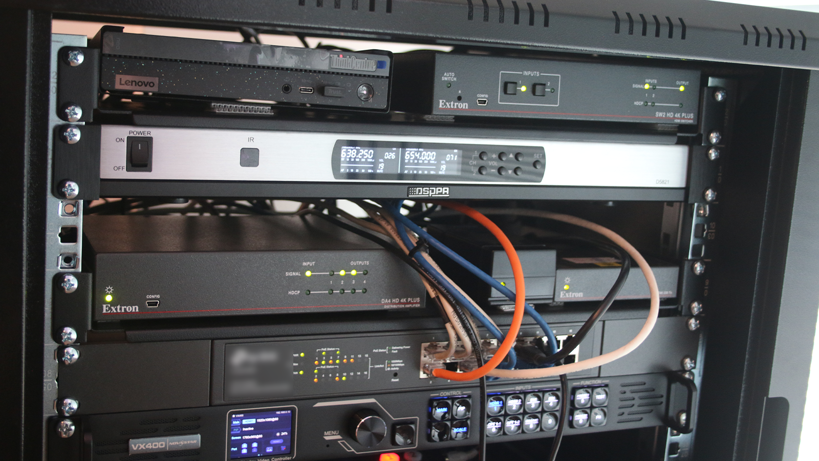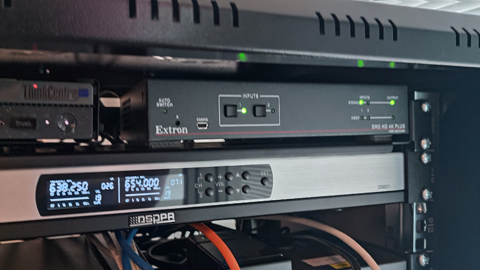 L’intervento, sviluppato in collaborazione con DP Tech, ha previsto la completa sostituzione della precedente infrastruttura audiovisiva e la realizzazione di un rack tecnico centralizzato, dove confluiscono i principali sistemi di controllo e distribuzione del segnale.