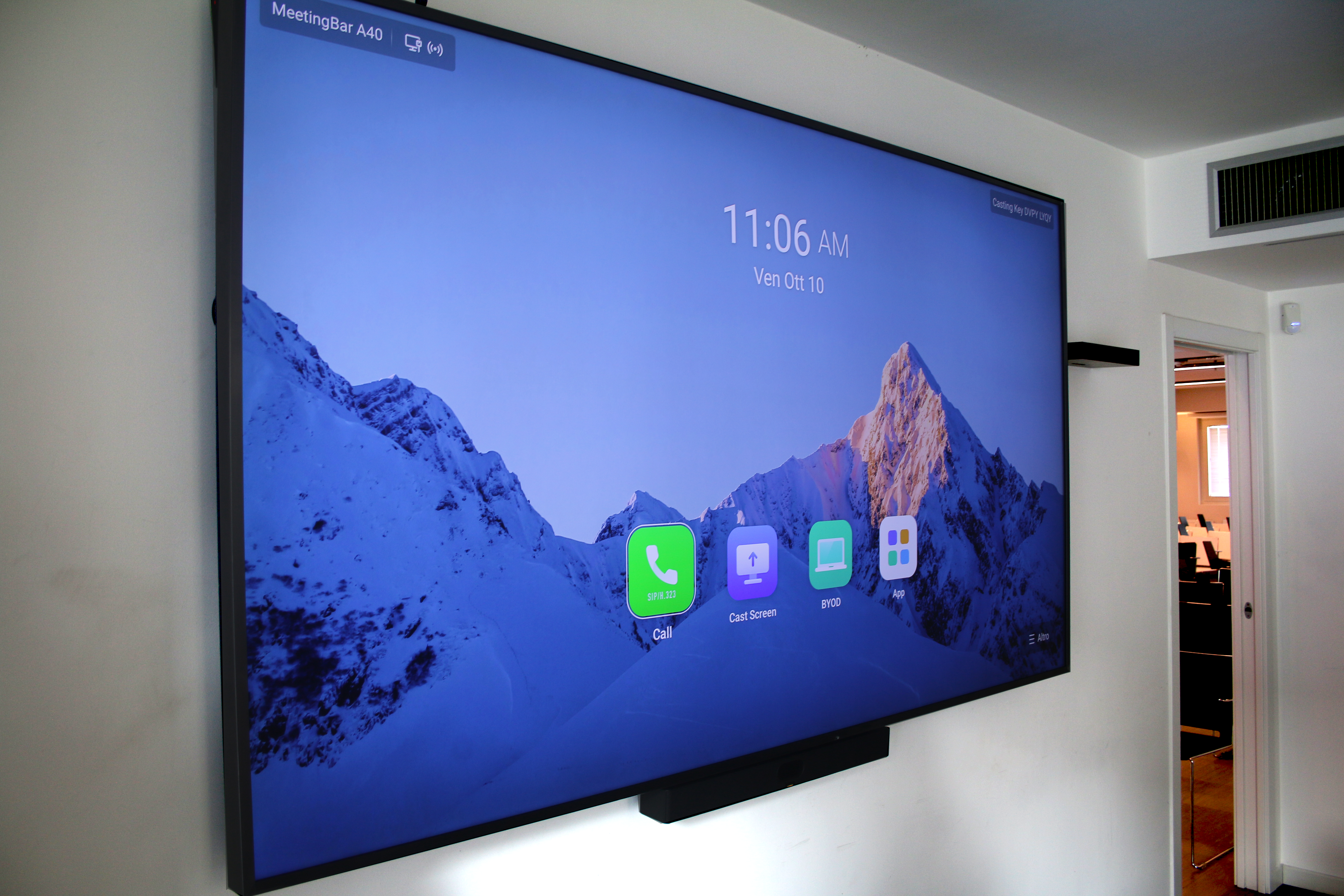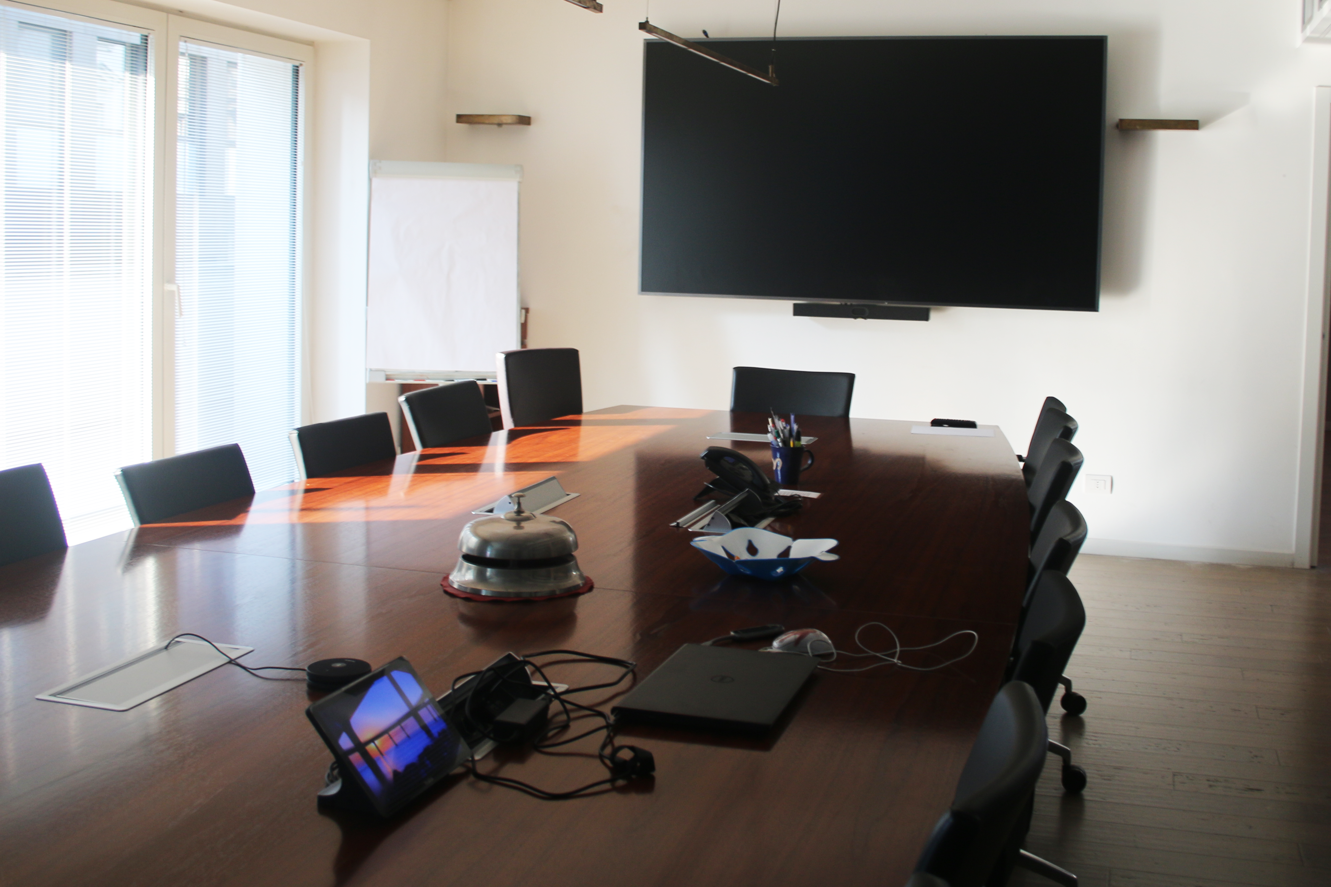 Il sistema di distribuzione video, realizzato con componenti Extron, permette di visualizzare sul monitor principale Samsung da 98 pollici i contenuti provenienti direttamente dalla sala conferenze, garantendo sincronizzazione e continuità tra gli spazi.
