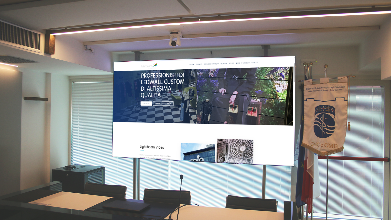 Il cuore visivo della sala convegni è rappresentato dal nuovo LEDwall Lightbeam Die Cast Wall Mount delle dimensioni di 2750x1500 mm, realizzato con 12 moduli da 1000x250 mm e 6 moduli da 750x250 mm, tutti con tecnologia SMD1212, passo 1.56 mm e refresh rate a 3.840 Hz. La combinazione di pannelli di diversa lunghezza consente una perfetta integrazione architettonica, mantenendo al tempo stesso uniformità cromatica, luminosità costante e nitidezza elevata anche in ambienti particolarmente illuminati.
