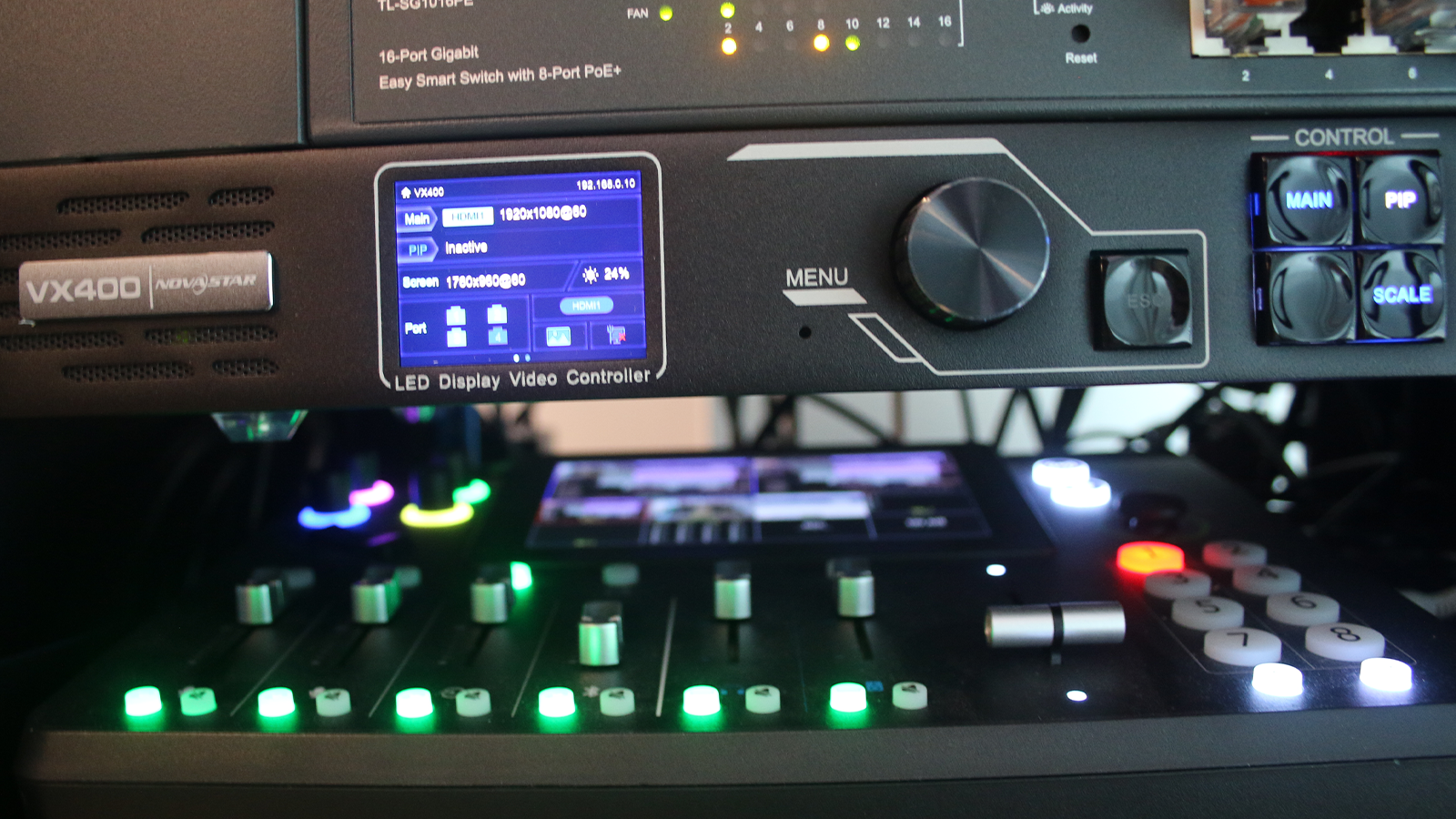 Il sistema è fissato a una struttura modulare in alluminio tecnico che assicura rigidità, precisione millimetrica e massima pulizia estetica, integrandosi perfettamente con l’arredo della sala. La gestione dei contenuti è affidata alla centralina Novastar VX400, un controller all-in-one con scaler integrato e connessioni ottiche che garantiscono trasmissione stabile, calibrazione immediata e regolazioni intuitive.