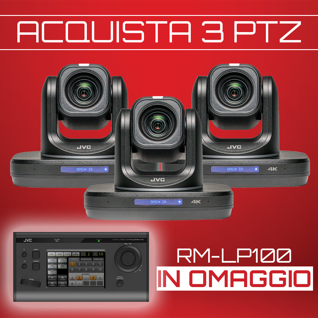 Oltre a un'incredibile riduzione di prezzo, per ogni ordine minimo di 3 telecamere PTZ tra i modelli KY-PZ400NWE, KY-PZ510BE, KY-PZ510WE o le telecamere PTZ con protocollo NDI®|HX3 KY-PZ510NBE e KY-PZ510NWE, riceverai in omaggio un pannello di controllo remoto per videocamere PTZ e camcorder IP RM-LP100E*.