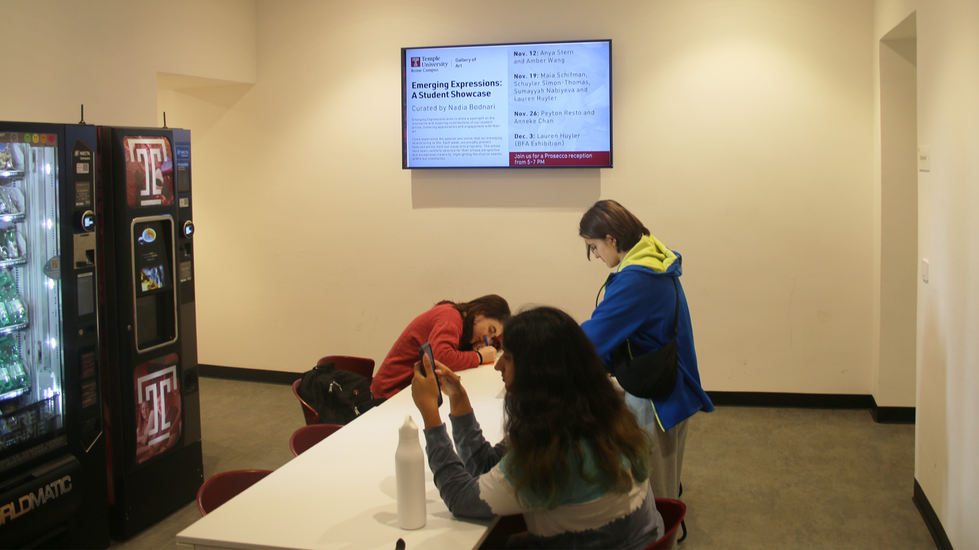 Abbiamo una biblioteca, aule di Print Making, Digital Photo, Architecture e una galleria d'arte che ogni tre settimane espone opere degli studenti o ospita artisti esterni. La gallery è un'opportunità per aprire al pubblico le porte di Temple University.