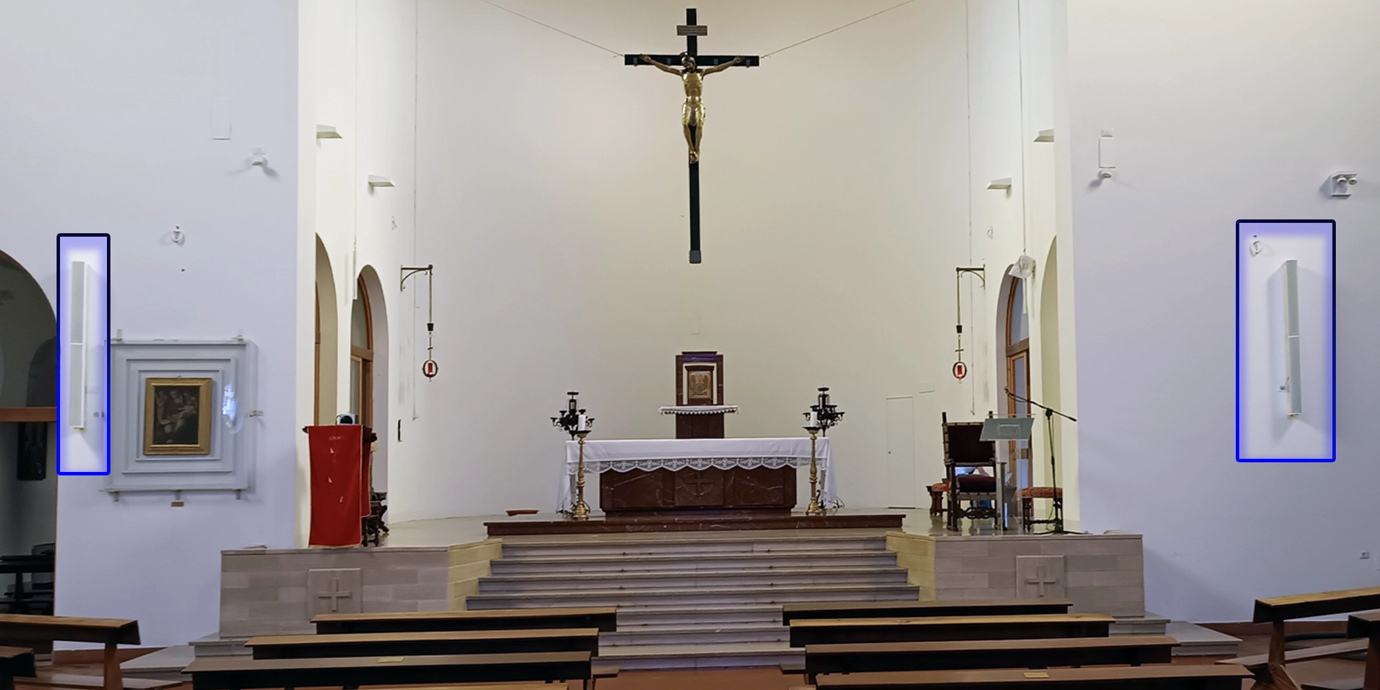 Questi modelli sono stati selezionati per il loro perfetto equilibrio tra tecnologia avanzata e design discreto, ideale per integrarsi senza compromettere l’estetica della chiesa. Grazie alla loro direttività controllabile digitalmente, i diffusori ALX-16D permettono di minimizzare le riflessioni sulle superfici e indirizzare il suono precisamente alle aree desiderate, garantendo così un valore ottimale di STI (Speech Transmission Index) in un ambiente acusticamente complesso. Questa tecnologia contribuisce a un miglioramento sostanziale dell’intelligibilità del parlato, rendendo l’ascolto piacevole e senza sforzo per i fedeli, indipendentemente dalla loro posizione nella chiesa.