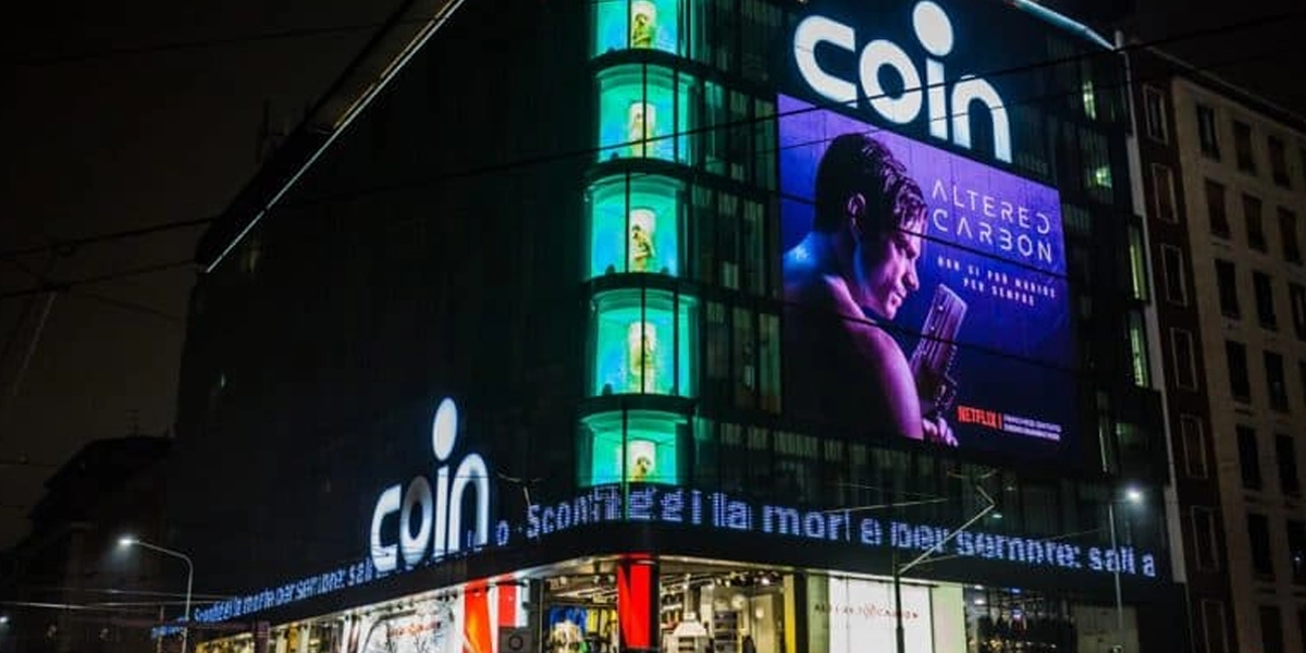 Il progetto offerto da Lightbeam permette da diversi anni a COIN di mostrare immagini uniche o separate sui tre piani.