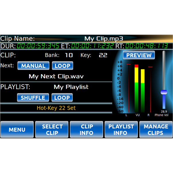 Questo lettore di clip audio completamente autonomo, a differenza dei PC, è dotato di pulsanti fisici per un feedback tattile immediato durante la riproduzione dei clip audio. L'ampio touchscreen a colori fornisce informazioni dettagliate sullo stato delle clip caricate, riprodotte e inserite.