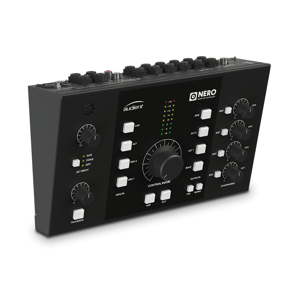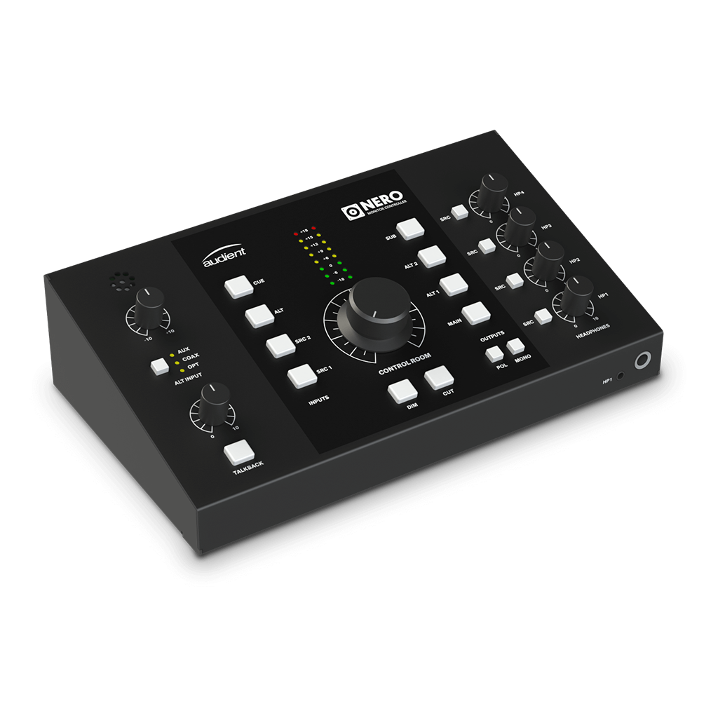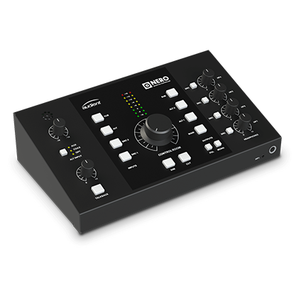 Il Desktop Monitor Controller Audient Nero ti consente di centralizzare, connettere e controllare tutte le tue esigenze di monitoraggio tramite un controller desktop intuitivo.