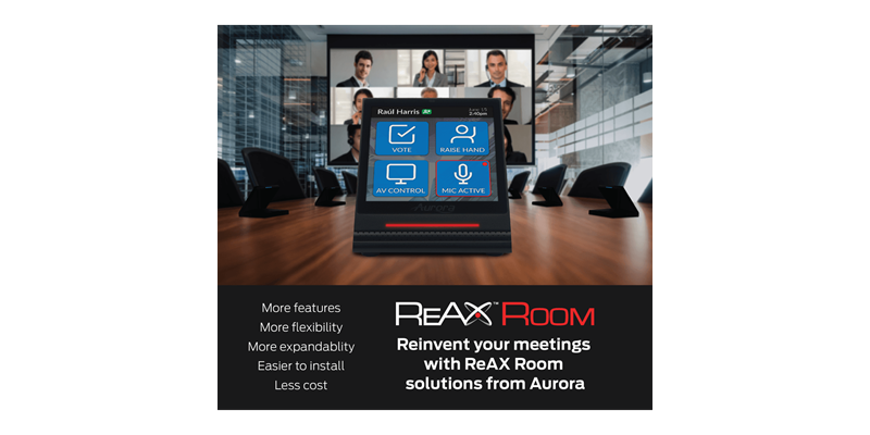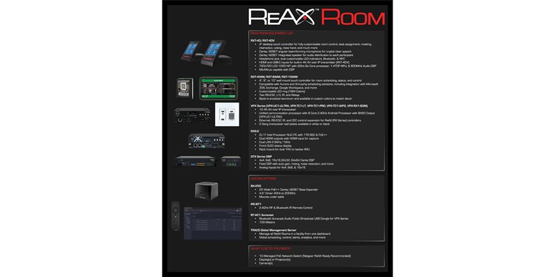 ReAX Room è una nuova e migliore soluzione per le riunioni, capace di risolvere tutti i problemi tipici delle sale conferenze. Il cuore della ReAX Room è il pannello touch RXT-4D/DV da 4” a forma compatta, dotato di microfono Dante/AES67 con beamforming e altoparlante integrato.