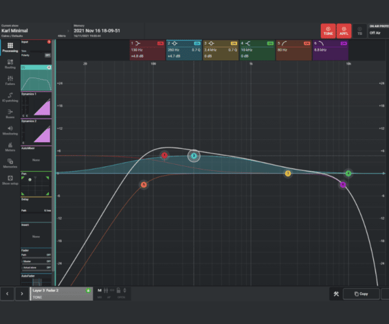 EQ su canali, gruppi e rete: 6 bande complete di EQ/filtri parametrici