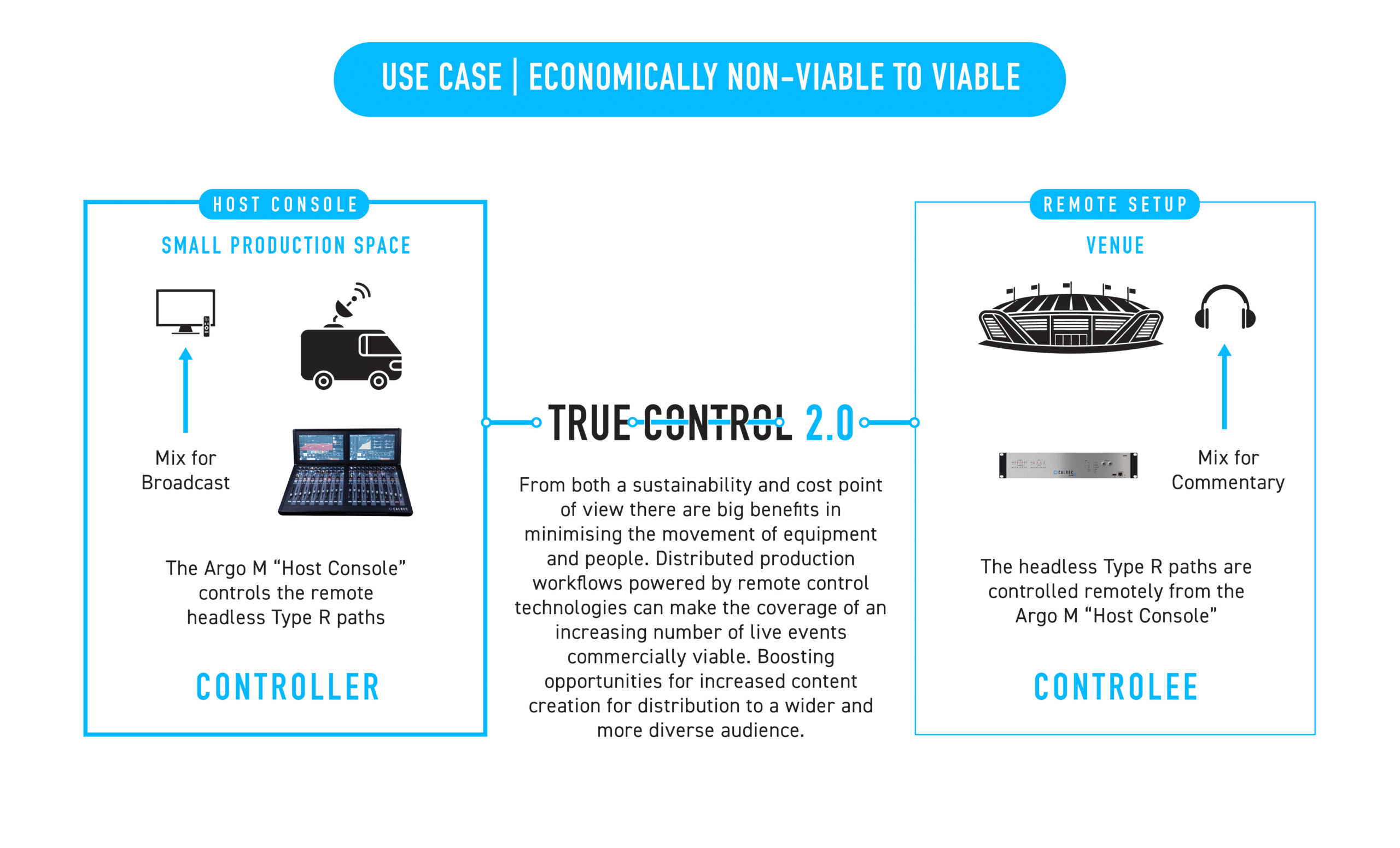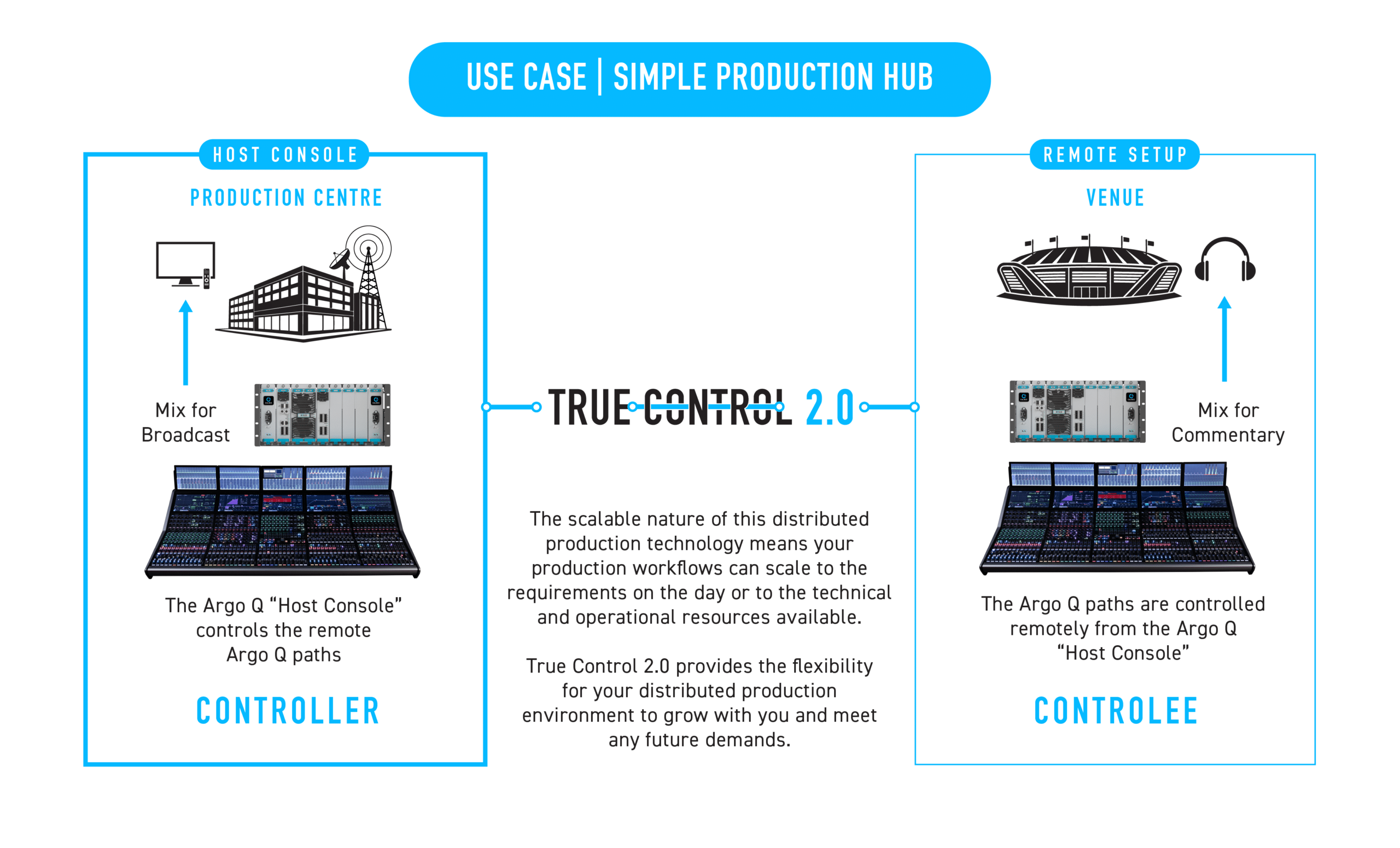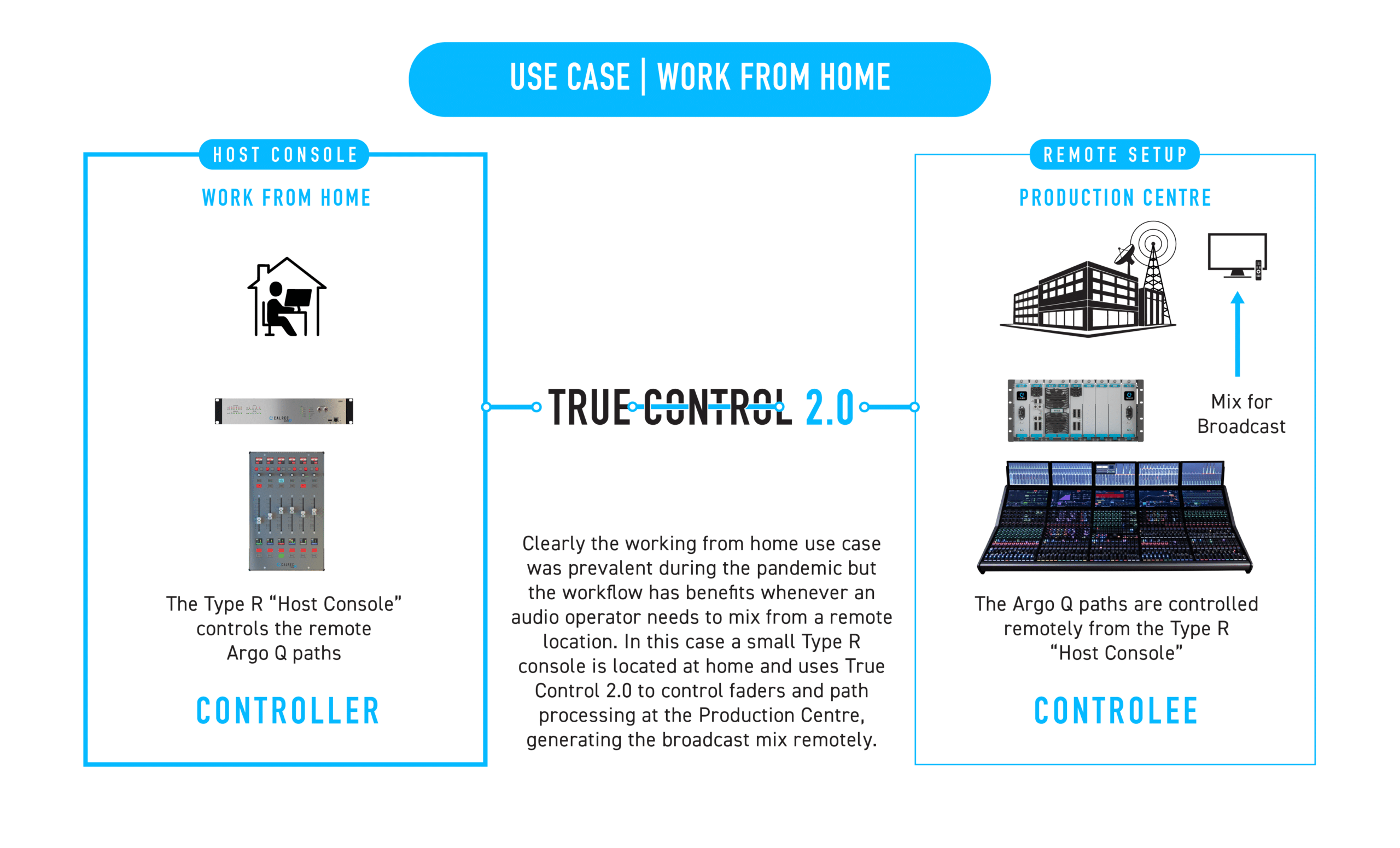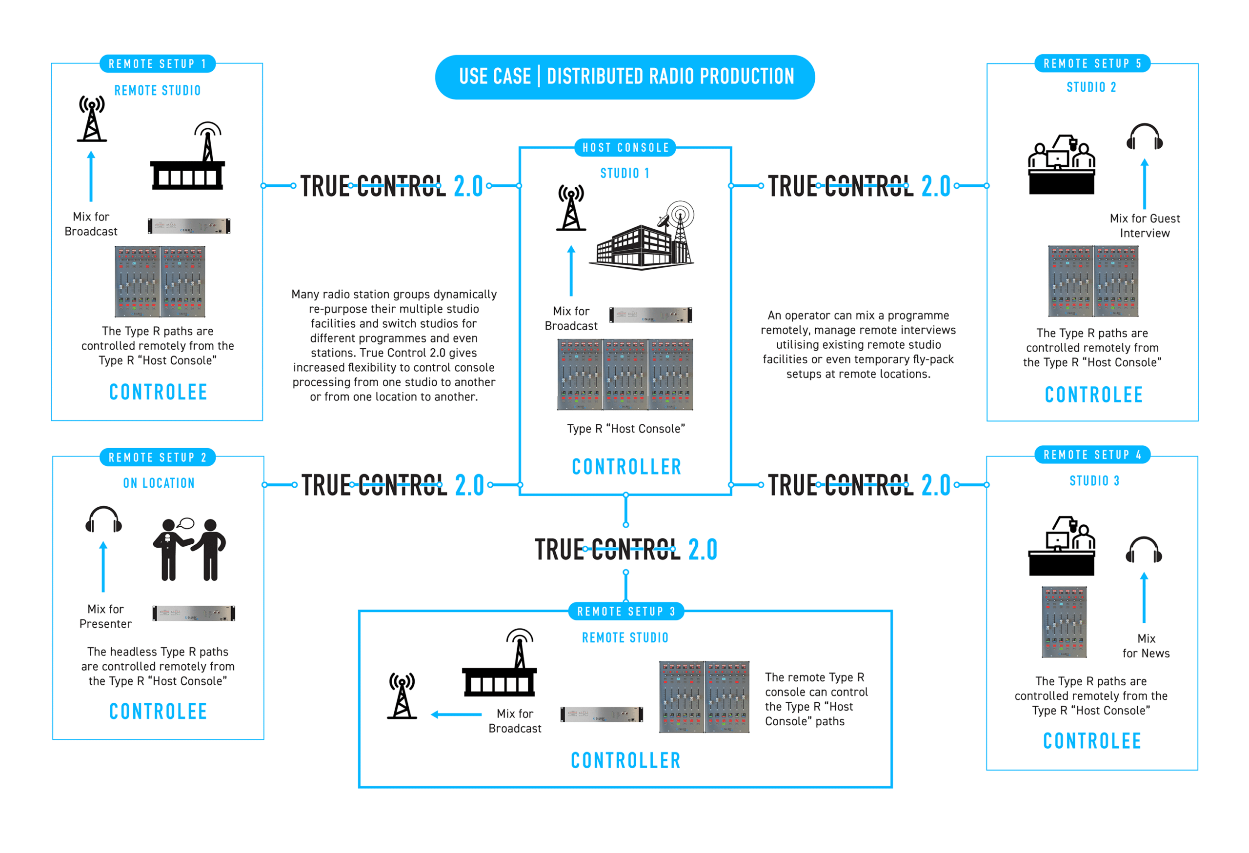 Per rispondere alla crescente complessità dei flussi di lavoro nel mondo broadcast, True Control 2.0 offre ai professionisti una flessibilità senza precedenti per scalare produzioni remote, gestire il disaster recovery, il controllo a distanza, scenari di backup e mix di effetti avanzati, grazie alla possibilità di connettere più dispositivi Calrec.