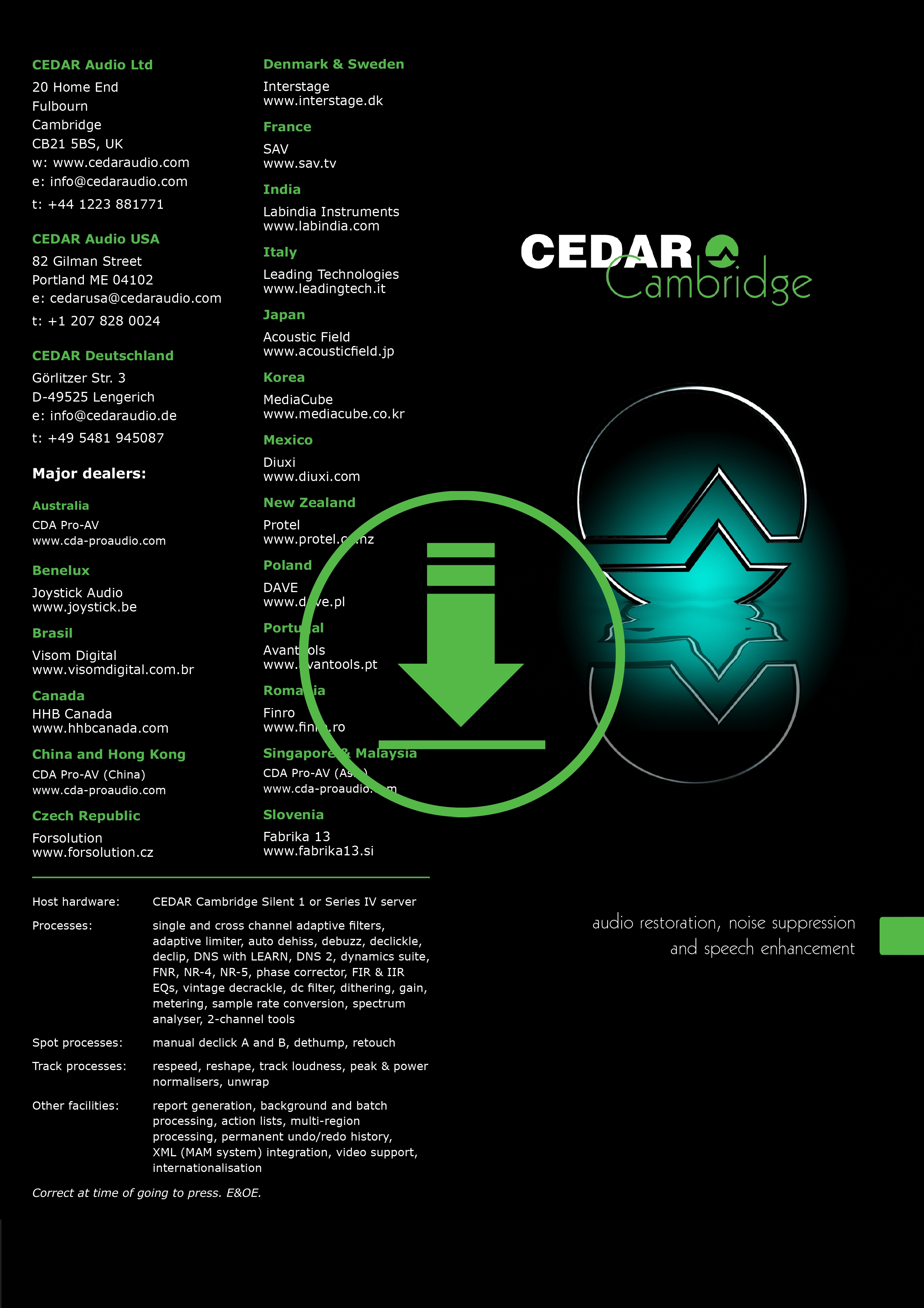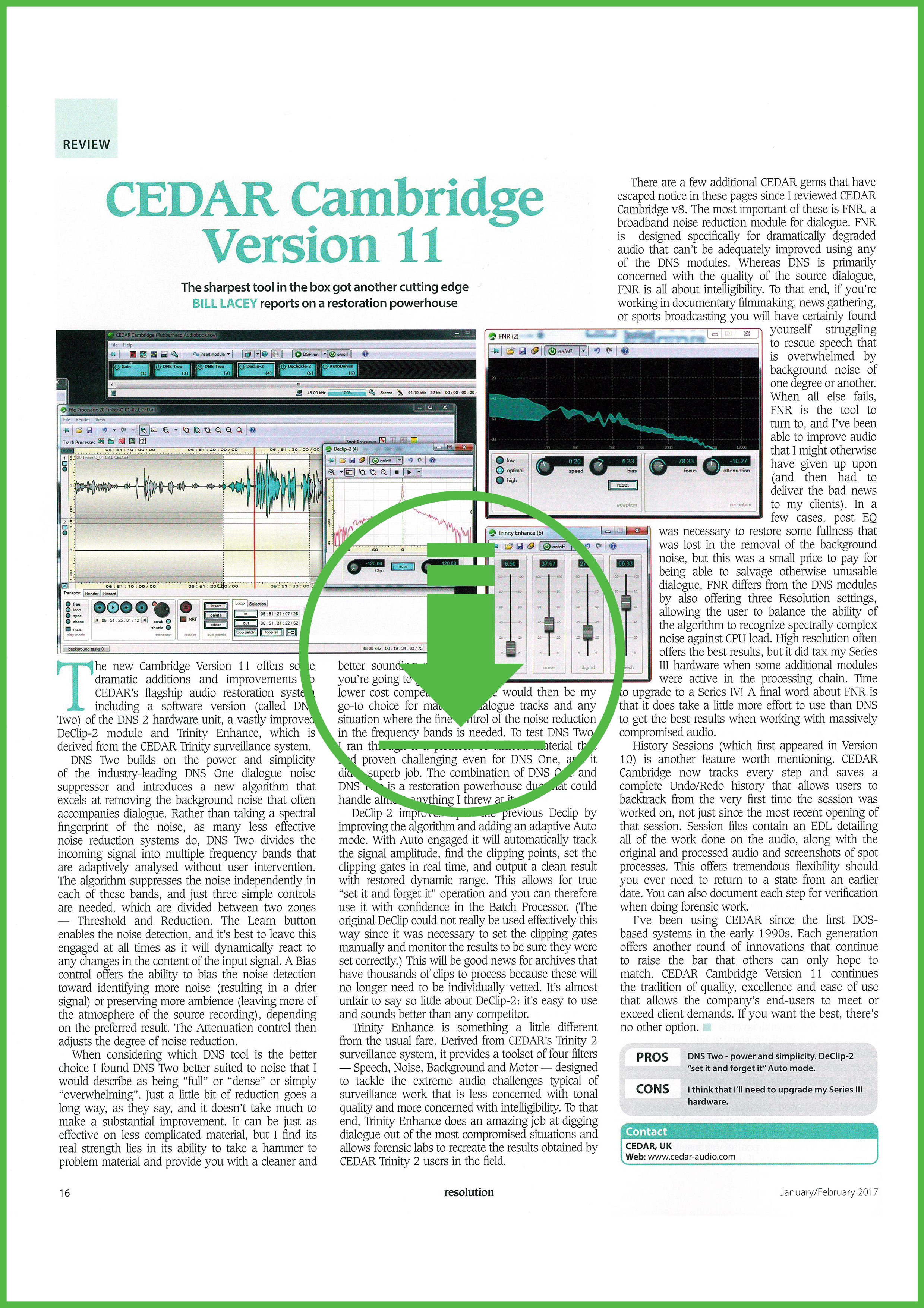 Sviluppato in collaborazione con l’omonima Università Inglese, Cedar Cambridge riesce a rimuovere molte tipologie di rumore senza danneggiare il segnale audio di partenza e senza introdurre artefatti di alcun tipo.I moduli di Cedar Cambridge sono l’ideale per la post-produzione, per la restaurazione di colonne sonore e di materiale audio per CD, DVD e archivi sonori, per applicazioni forensi e molto altro ancora.