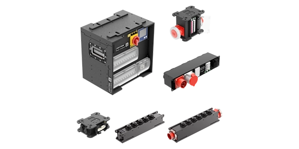 Le scatole di distribuzione dell'alimentazione sono disponibili in diversi fattori di forma con diverse interfacce popolari tra cui powerCON TRUE1, Harting E16, Socapex, Schuko.
