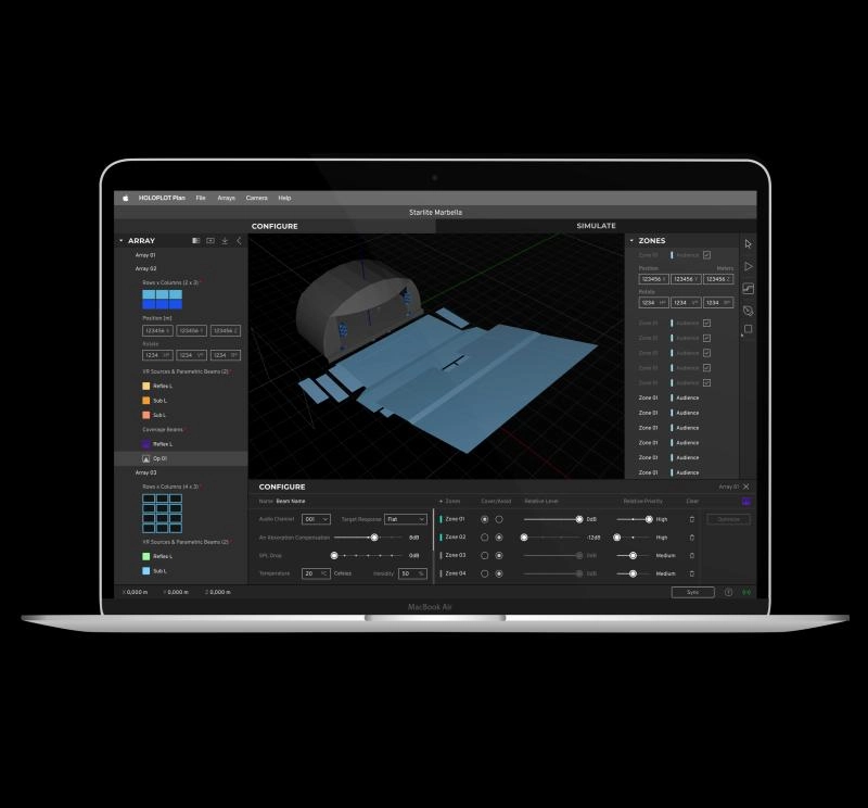 HOLOPLOT Plan mette nelle tue mani le chiavi della rivoluzione del controllo sonoro: visualizza l'impatto diretto dei fasci di copertura, applica il 3D Audio-Beamforming per ottimizzare il tuo progetto e prepara l'esportazione verso AFMG EASE per simulazioni acustiche avanzate in ambienti chiusi.