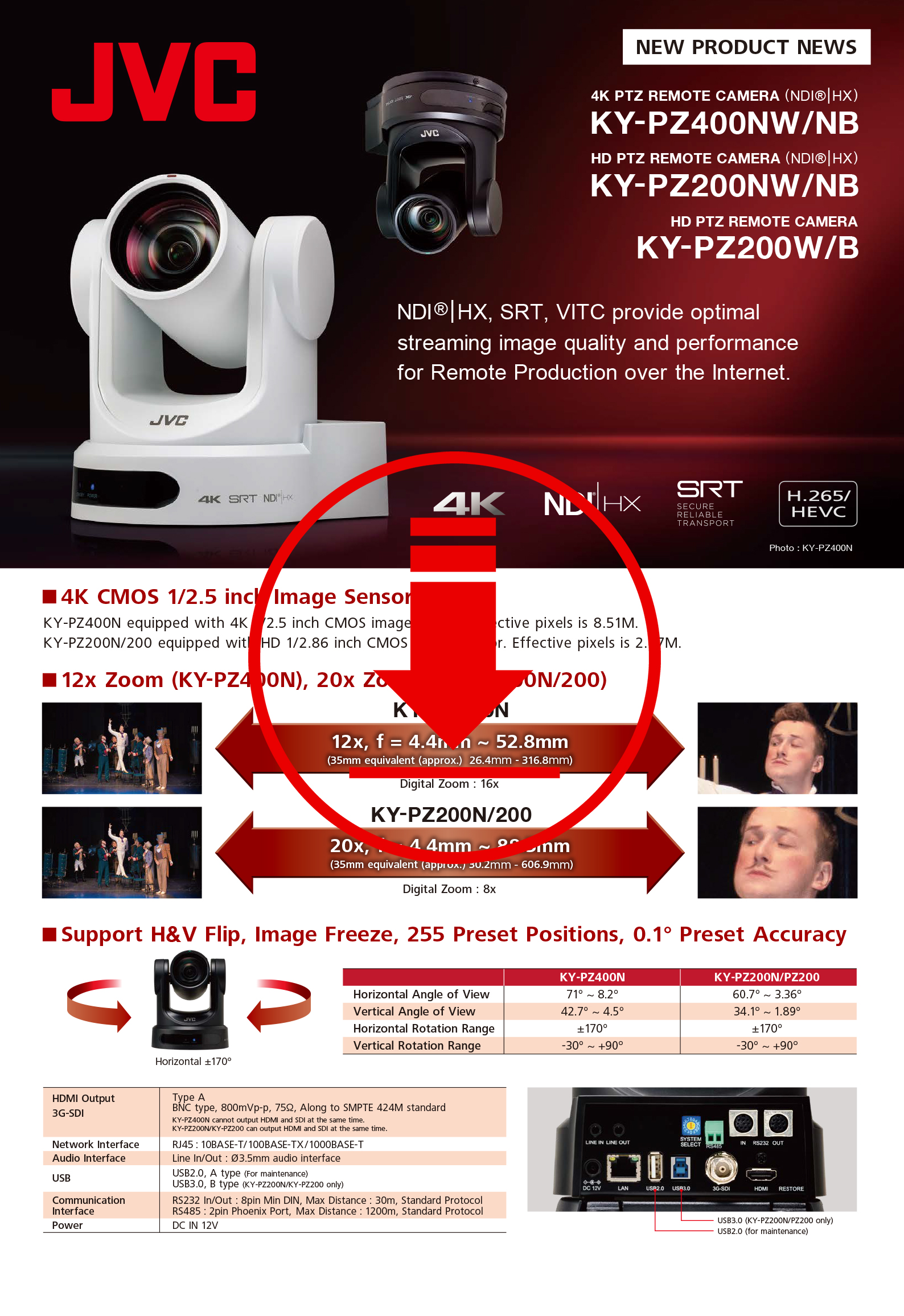 La nuova telecamera FHD Pan Tilt Zoom KY-PZ200N di JVC supporta SRT e POE per una vera e propria soluzione one wire che, grazie ad una risoluzione fino a 1080p60, un sensore CMOS HD da 1/2,8" e un obiettivo con zoom ottico 20x integrato, è in grado di garantire l’acquisizione di immagini nitide durante svariate applicazioni: dalla didattica alla produzione di eventi live, dalle installazioni in luoghi di culto e nelle scuole all’utilizzo nelle sale riunioni e conferenze.