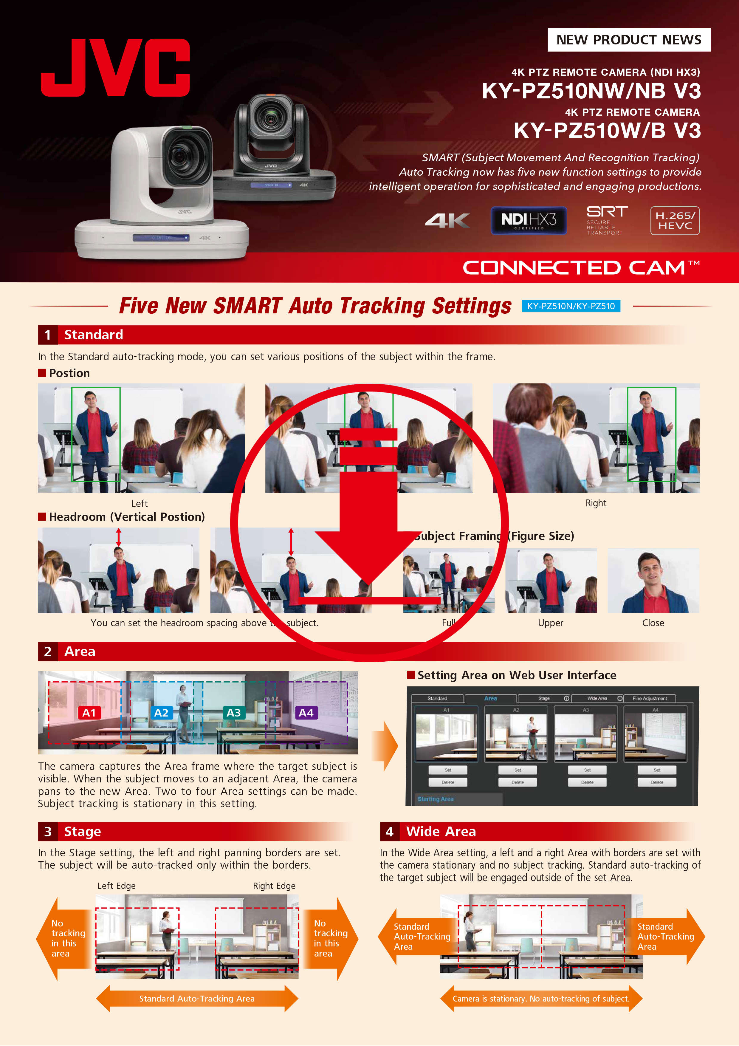 La nuova telecamera 4K Pan Tilt Zoom KY-PZ510BE di JVC, disponibile anche in versione NDI (KY-PZ510NBE) supporta i protocolli SRT, RTSP, RTMP e RTMPS per una vera e propria soluzione one wire che, grazie ad una risoluzione fino a 4K, un sensore CMOS HD da 1/2,8" e un obiettivo con zoom ottico 12x integrato, è in grado di garantire l’acquisizione di immagini nitide durante le riprese in studi televisivi o su campi sportivi.