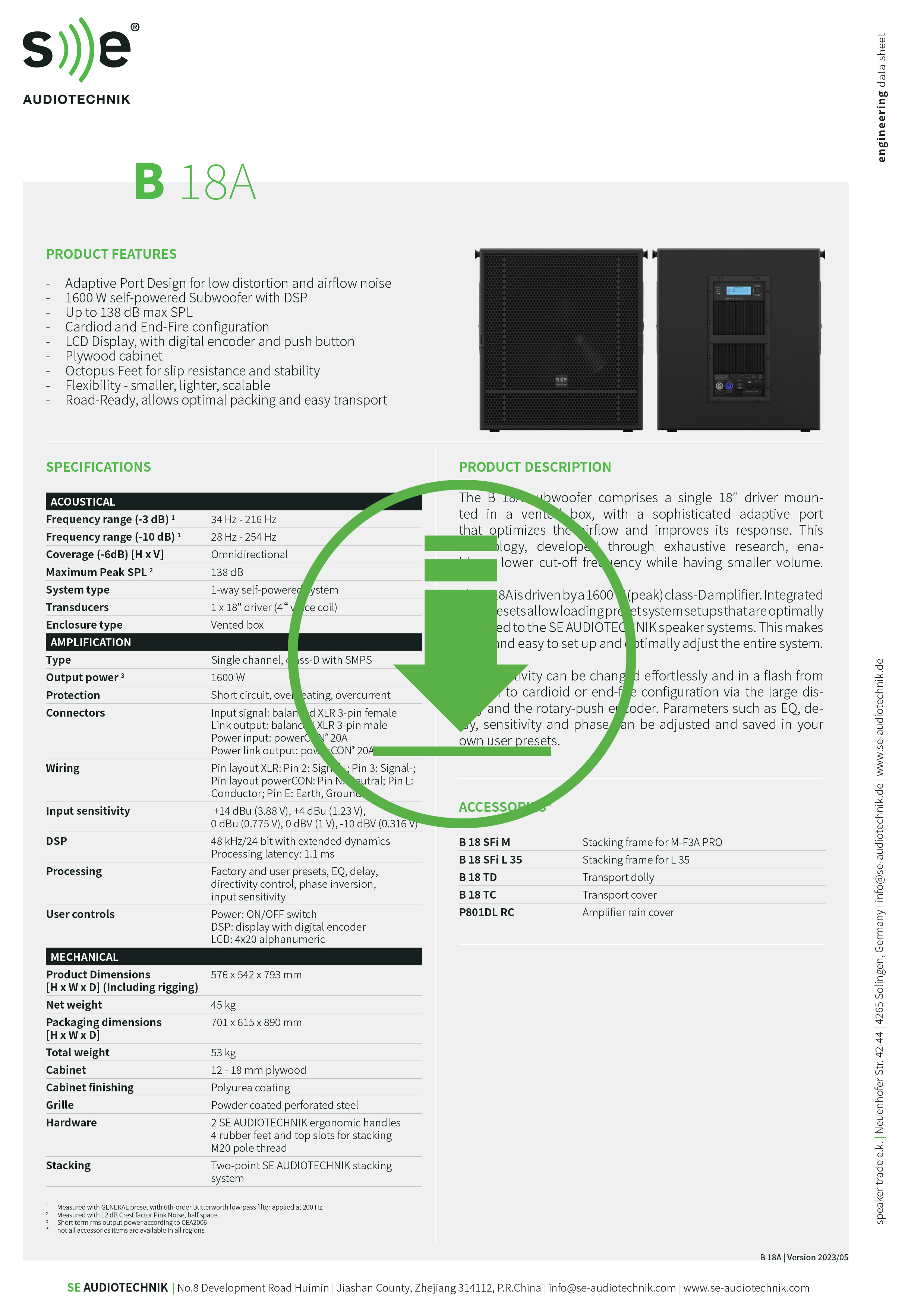 B-18 è un subwoofer multiuso bass-reflex passivo multiuso con woofer SE AUDIOTECHNIK 18″ ad alta potenza con una risposta in frequenza estremamente piatta che si estende fino a 28 Hz.