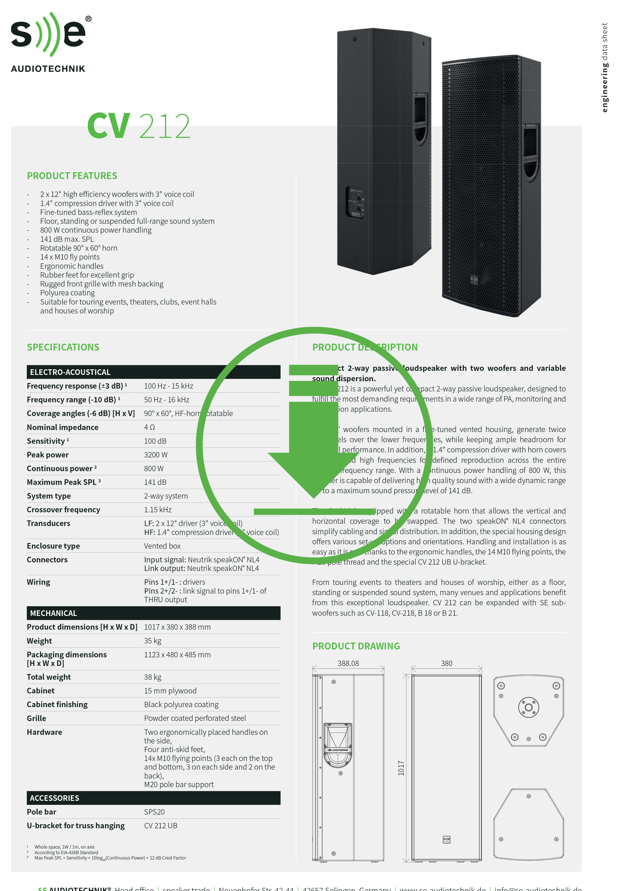 Grazie a un cabinet in legno multistrato da 15 mm, una robusta griglia in metallo, piedini in gomma per una sicura aderenza e 2 comode maniglie per il trasporto, questo prodotto di SE Audiotechnik è utilizzabile con le altre serie di diffusori Se Audiotechnik e con diffusori di altri marchi, come impianto principale in appoggio, appeso con i golfari o agganciato direttamente su truss con la staffa a "U" CV212UB opzionale, montato su stativo per diffusore o abbinato ad un subwoofer (CV-118B, CV-218, B18, B21) trova impiego anche come valido stage monitor.